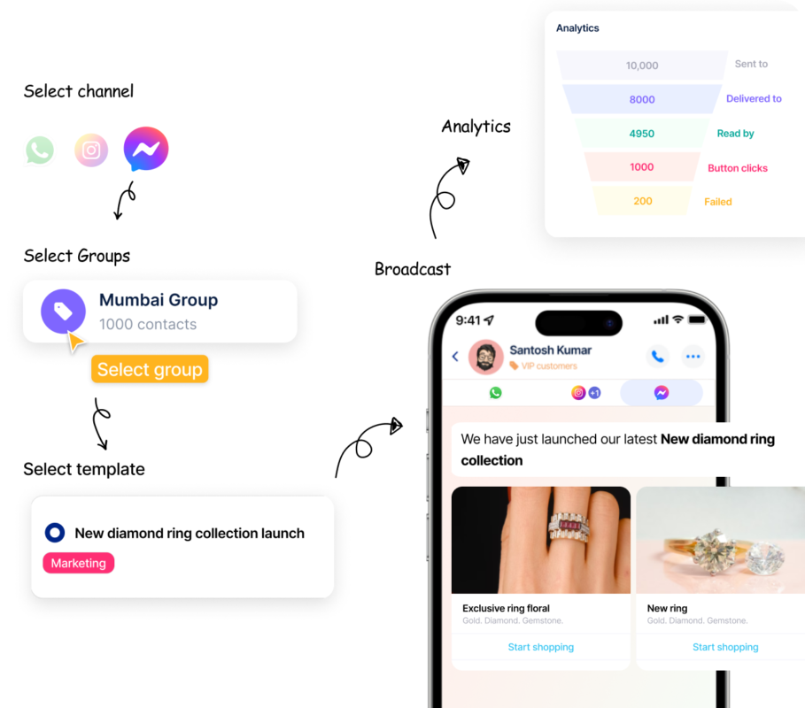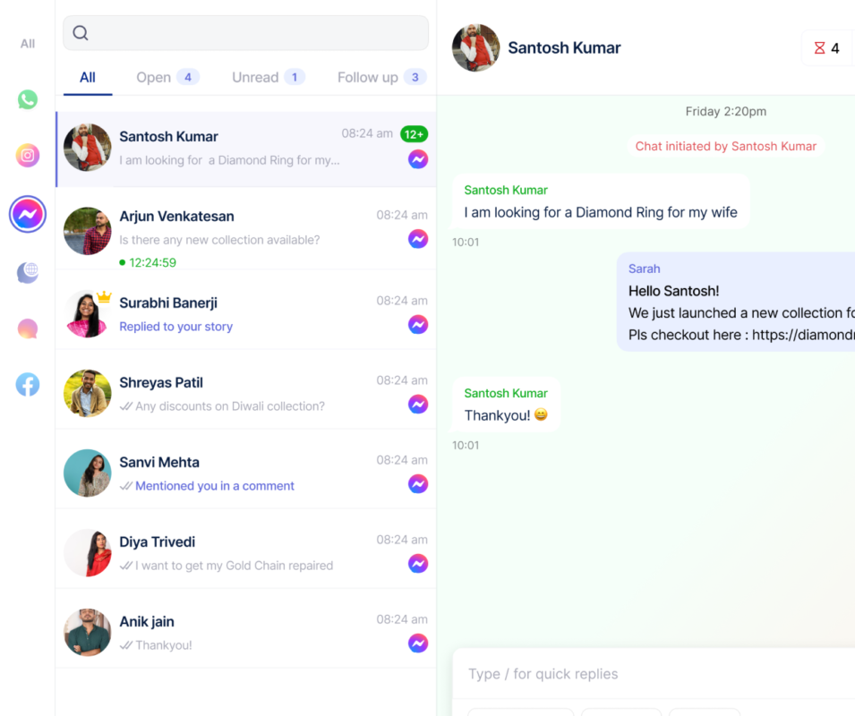 Jwero Chats is a powerful multi-channel messaging platform tailored for jewellers. It allows seamless customer communication across WhatsApp, Instagram & Facebook (DMs and Comment replies), and your website’s chat, all from a single, easy-to-use dashboard. Built on Meta’s WhatsApp Business API.